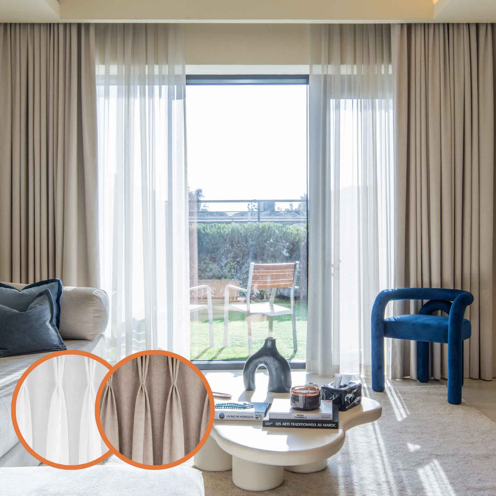 قضيب واحد، طبقتان فقط. هذا كل ما تحتاجه. الستارة المعتمة (Blackout) تحجب الضوء والحرارة وقت الحاجة، بينما تضيف الستارة الشفافة الخصوصية والنعومة في وضح النهار. معاً، تمنحك الستائر المزدوجة تحكماً كاملاً من دون أي تعقيد. وفي الإمارات، حيث النوافذ واسعة والشمس أكثر سطوعاً، هذا النوع من المرونة يُعتبر ضرورة.